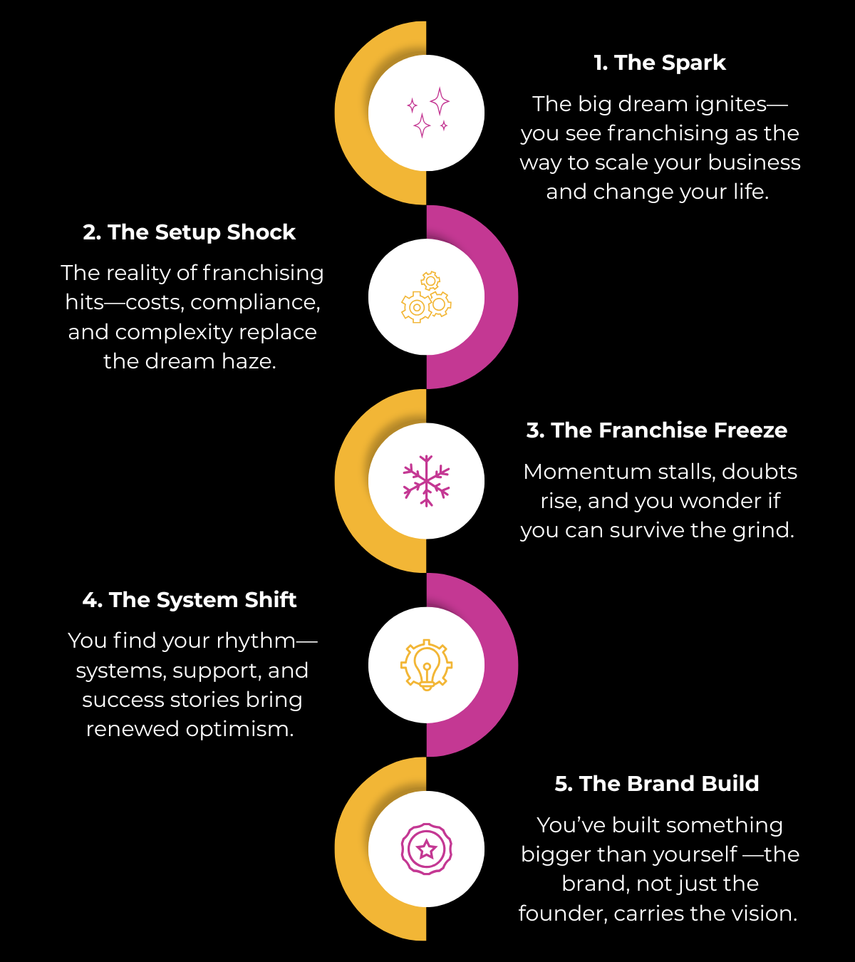 The Franchisor’s Five™ offers clarity to spot where you are, confidence that your challenges are normal, and a framework to help you better understand the road ahead.